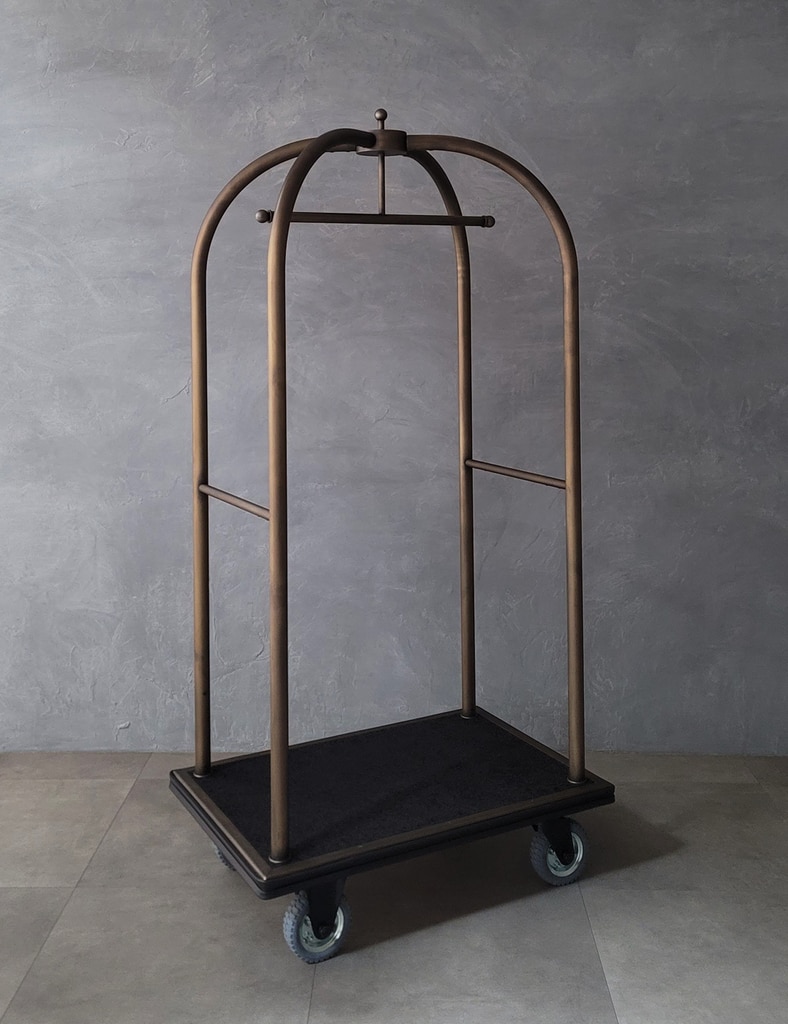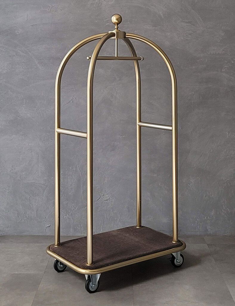 バゲージカートのデザインの特徴としては、上部に球体の飾りがあり、アーチ状の太いパイプのフレーム構造になっています。球体の下には、洋服を掛けれるようにハンガーバーが取付けられていて、下の台車部分は赤色のカーペットが貼ってあります。現在ではバリエーションも増えていますが、この形状がよく見かけるバゲージカートのデザインです。カラーについては、黒や銀色などのシックなものから、真鍮色など高級感のあるゴールド系が最も多く見られます。