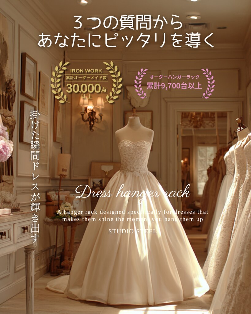 たった3つの選択で、あなたのお店にふさわしいドレスハンガーラックが現れる。